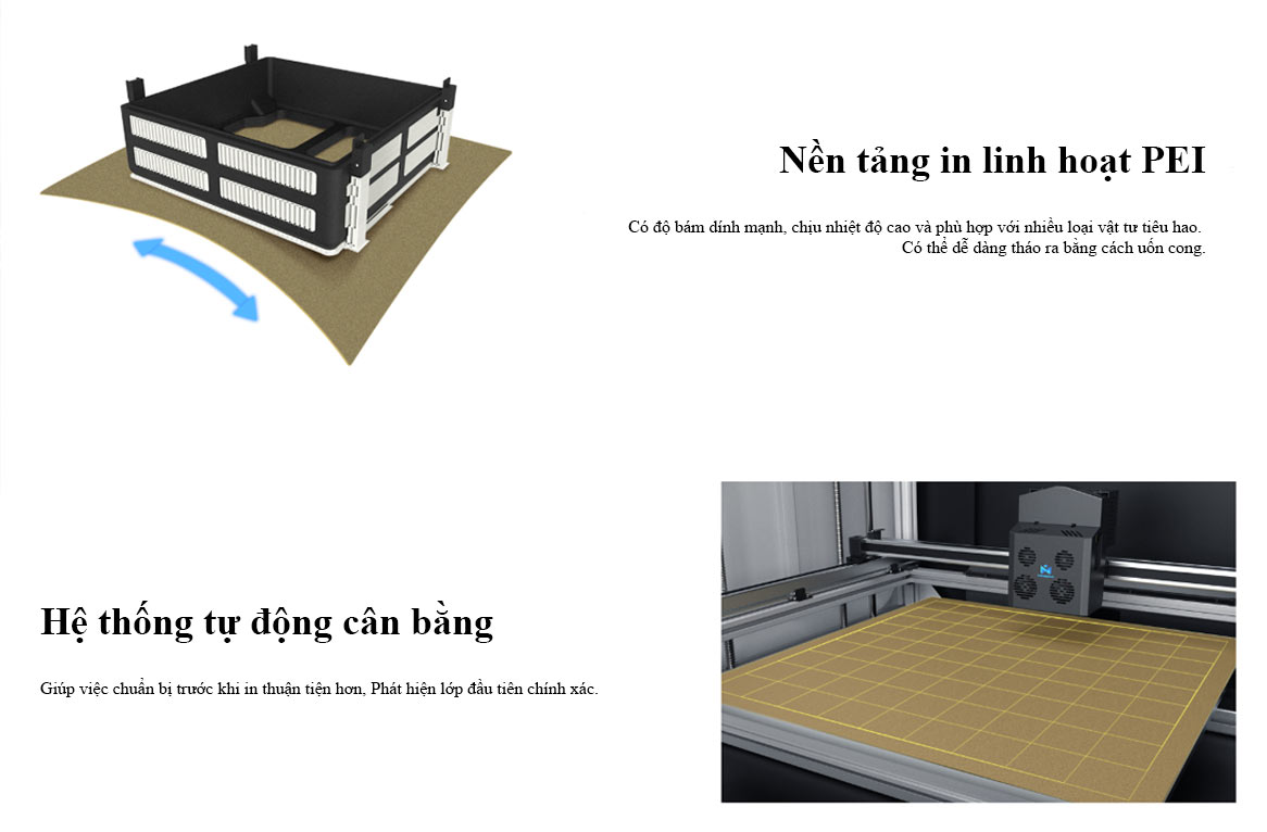 Hệ thống cân bằng tự động cải thiện đáng kể hiệu quả in và độ ổn định chất lượng. Giúp giảm thiểu các bản in lỗi do tấm tạo hình không cân bằng. Hiệu chuẩn chính xác khoảng cách vòi phun cũng cho phép máy in 3D in các mô hình có độ phân giải lớp mịn hơn.