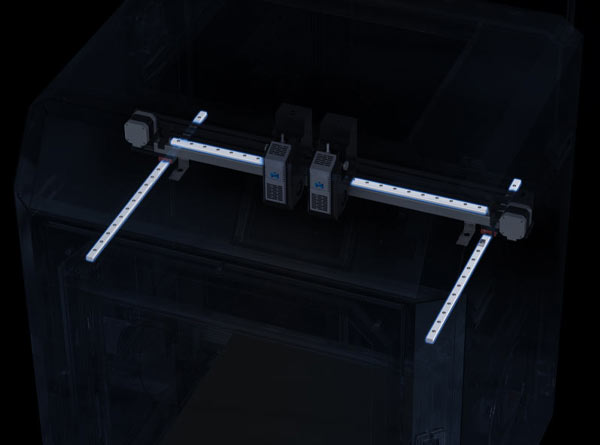 Với IDEX, MD-400D mang lại khả năng in song song ấn tượng, giúp giảm một nửa thời gian chờ đồng nghĩa với việc tăng gấp đôi năng suất. Hệ thống đùn kém hoặt động độc lập trên trục X cho phép thực hiện 2 bản in cùng lúc.