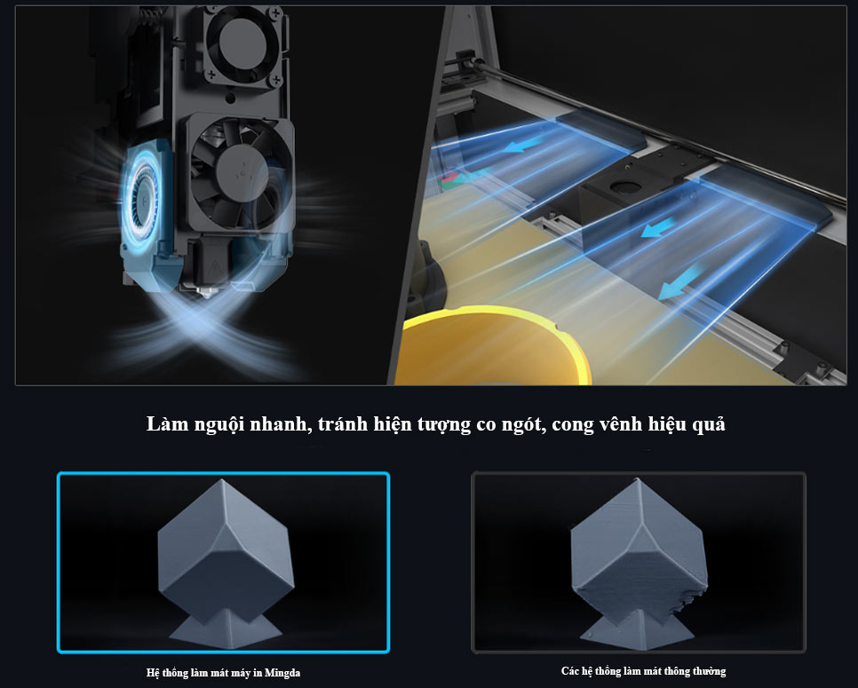 Hệ thống làm mát kép thực sự đưa khả năng làm mát mô hình lên một tầm cao mới với thiết kế ống dẫn khí động học thổi luồng khí định hướng cực mạnh vào mô hình để tăng cường khả năng làm mát, tạo ra những bản in hoàn hảo.